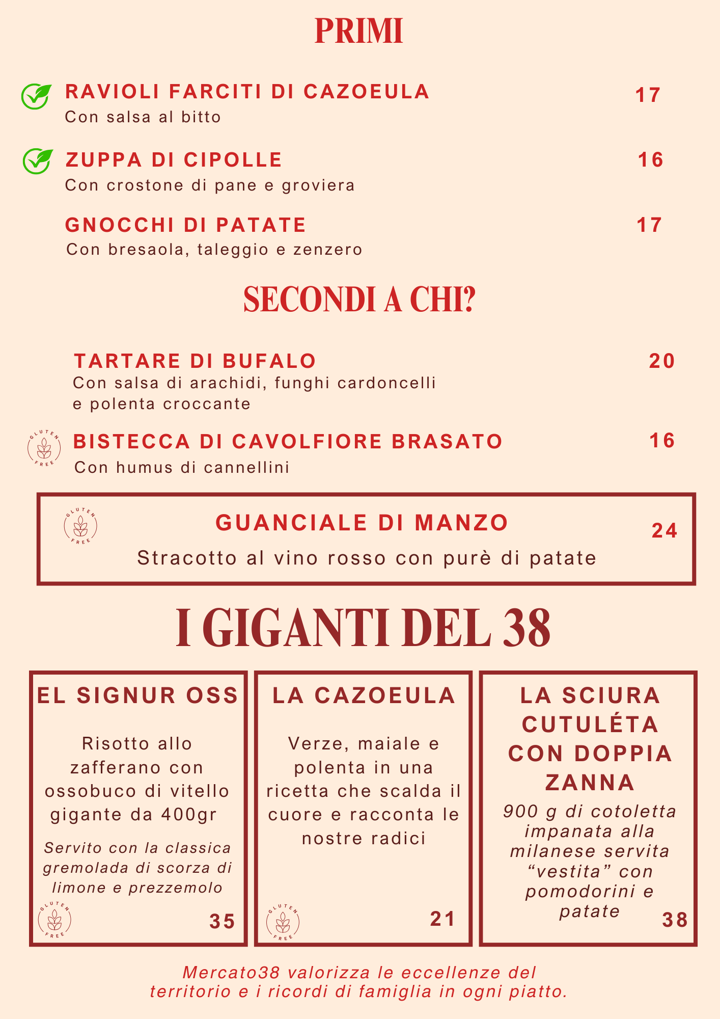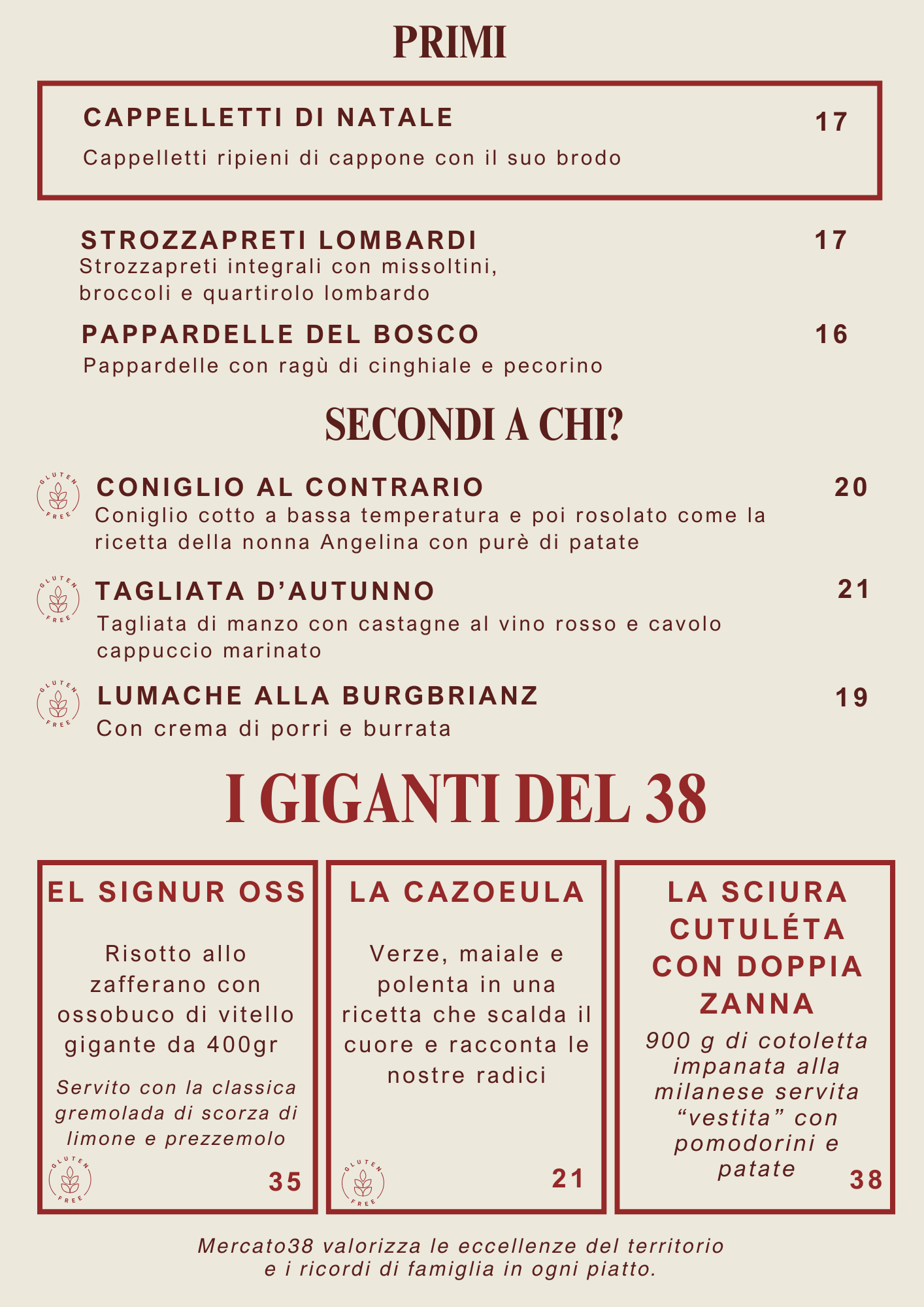 Non dimentichiamo, naturalmente, i dolci fatti in casa e la nostra carta dei vini, che accompagna alla perfezione ogni piatto. Ogni portata è preparata con amore e attenzione, perché vogliamo che ogni pasto al Mercato 38 sia un’esperienza indimenticabile. Guarda il nostro menu online o vieni a trovarci per scoprire le specialità del giorno.