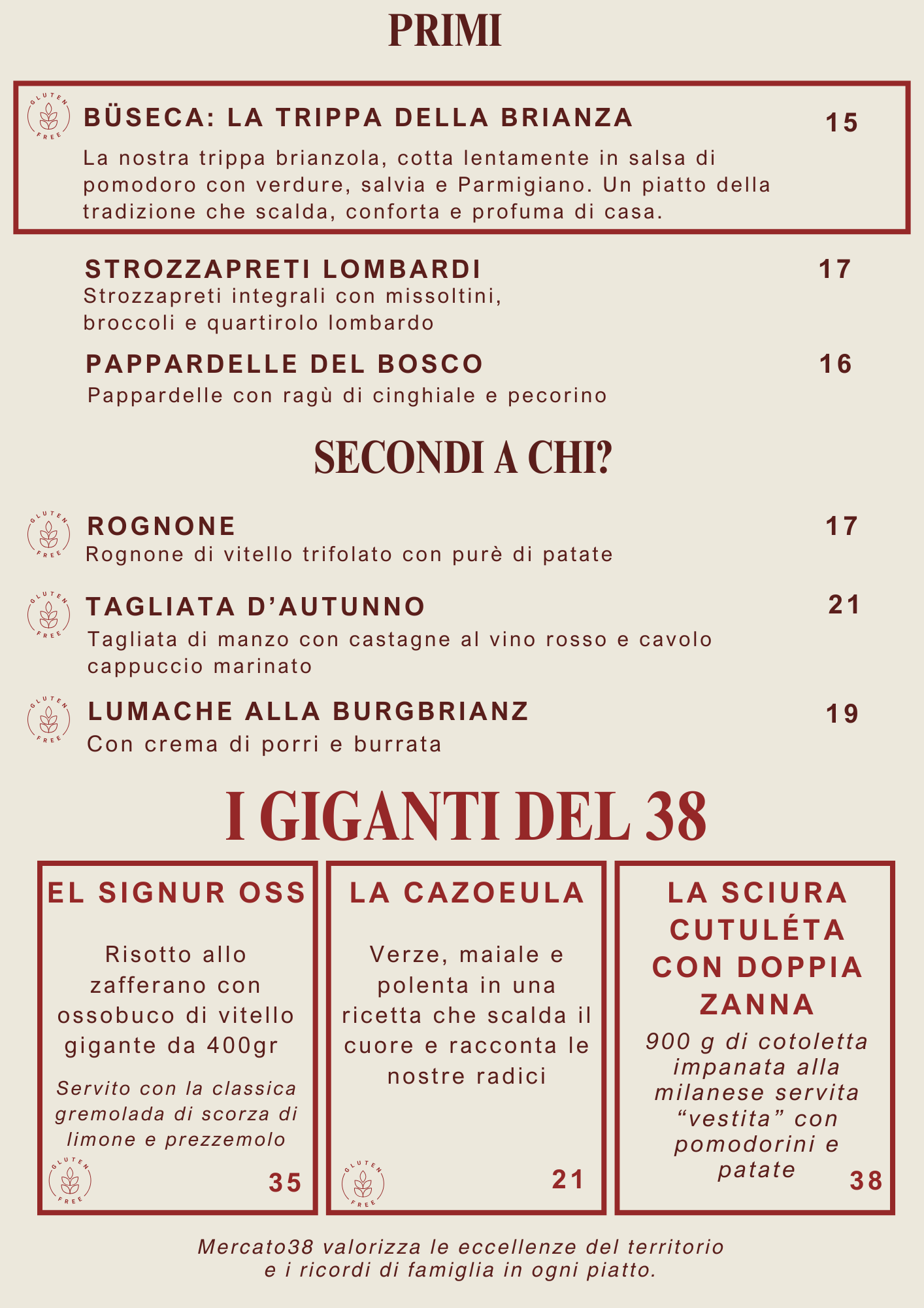 Benvenuti al Mercato 38 Trattoria Italiana di Erba, dove la passione per la cucina italiana incontra l’amore per la qualità. Dal 2019, Manuel e Alice hanno trasformato la loro idea in realtà, creando un luogo unico, informale ma curato, dove ogni piatto racconta una storia di sapori autentici e ingredienti freschi. Il nostro menu ristorante è un invito a esplorare la ricchezza della tradizione culinaria italiana, reinterpretata con fantasia e cura nei dettagli.